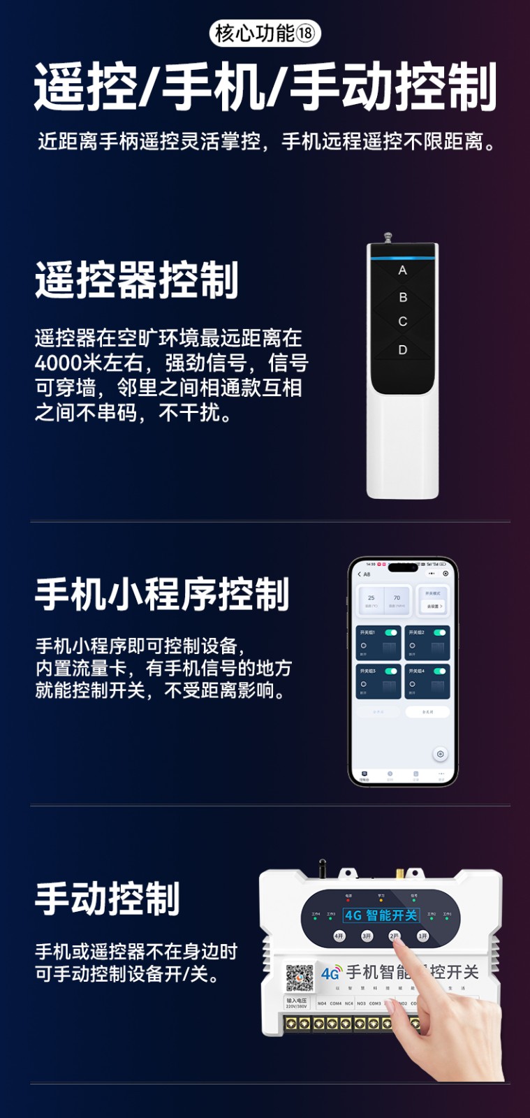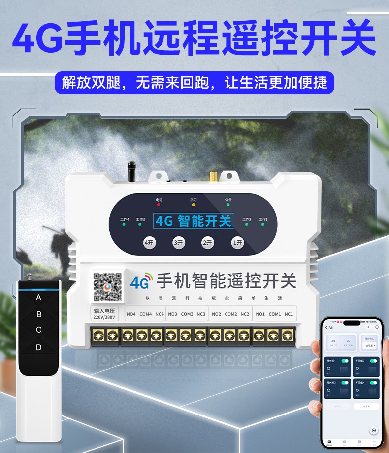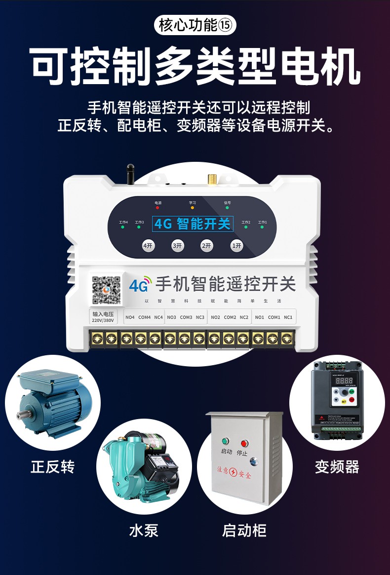 4G遠(yuǎn)程控制開關(guān)(YS-A8) 產(chǎn)品規(guī)格 功能特點(diǎn) 資料下載 4G遠(yuǎn)程控制開關(guān)(YS-A8)無需流量、無需插卡 、無需WIFI手機(jī)小程序控制定時開關(guān):云端定時 、本地定時、 倒計時多人控制斷電提醒 +信息推送狀態(tài)檢測三種工作模式自動切換:點(diǎn)動模式 、互鎖模式 、自鎖模式工作電壓: 220v/380v (可選)應(yīng)用場景:正反轉(zhuǎn)、水泵、啟動柜、變頻器 、魚塘增氧機(jī)、抽水泵、工業(yè)電機(jī)、燈具電器等